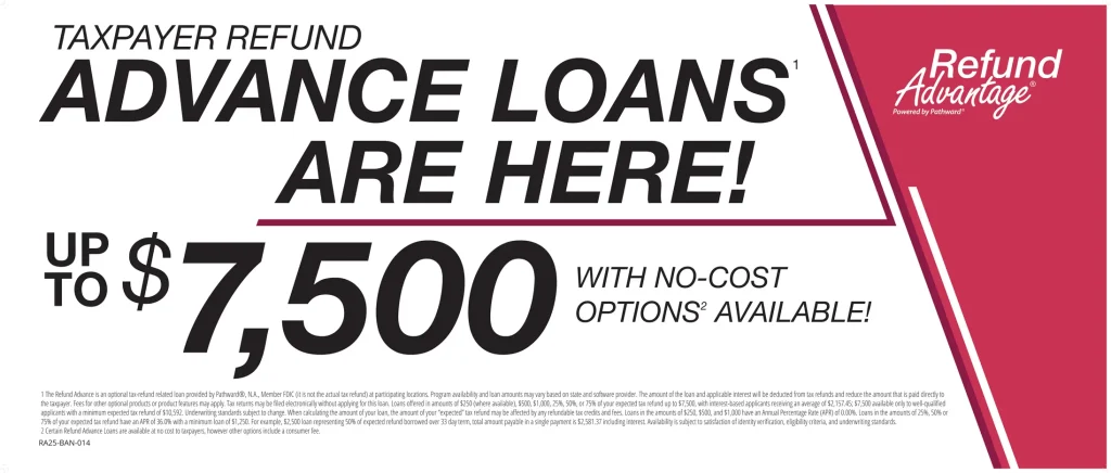 ¹ The Refund Advance is an optional tax-refund related loan provided by Pathward®, N.A., Member FDIC (it is not the actual tax refund) at participating locations. Program availability and loan amounts may vary based on state and software provider. The amount of the loan and applicable interest will be deducted from tax refunds and reduce the amount that is paid directly to the taxpayer. Fees for other optional products or product features may apply. Tax returns may be filed electronically without applying for this loan. Loans offered in amounts of $250 (where available), $500, $1,000, 25%, 50%, or 75% of your expected tax refund up to $7,500, with interest-based applicants receiving an average of $2,157.45; $7,500 available only to well-qualified applicants with a minimum expected tax refund of $10,592. Underwriting standards subject to change. When calculating the amount of your loan, the amount of your “expected” tax refund may be affected by any refundable tax credits and fees. Loans in the amounts of $250, $500, and $1,000 have an Annual Percentage Rate (APR) of 0.00%. Loans in the amounts of 25%, 50% or 75% of your expected tax refund have an APR of 36.0% with a minimum loan of $1,250. For example, $2,500 loan representing 50% of expected refund borrowed over 33 day term, total amount payable in a single payment is $2,581.37 including interest. Availability is subject to satisfaction of identity verification, eligibility criteria, and underwriting standards.